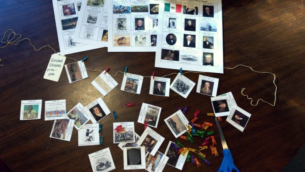 Your timeline can show that things were taking place in the world at the same time. One way to do this is to display timeline figures on the wall with string. You can use different colors of string for each continent or country you are studying. Hang the strings horizontally on the wall and stack them parallel to one another.